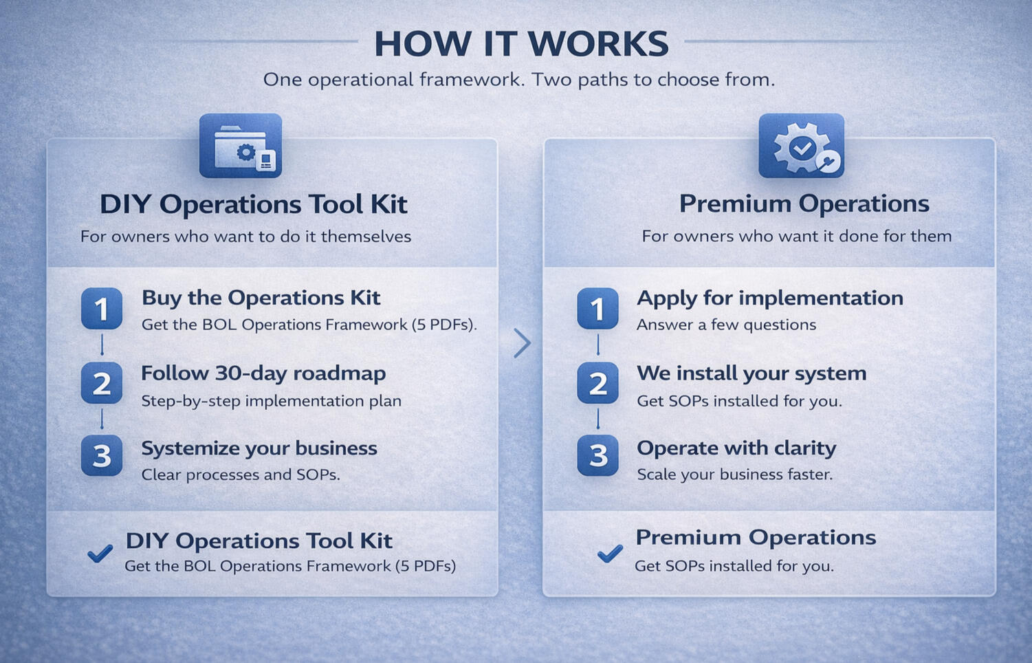 Business Operations Lab is a digital operations framework designed to help U.S. small business owners document, systemize, and stabilize their operations — without consultants or unnecessary complexity.The focus is execution: clear systems, practical SOPs, and operational clarity that reduce owner dependency and allow the business to operate consistently.